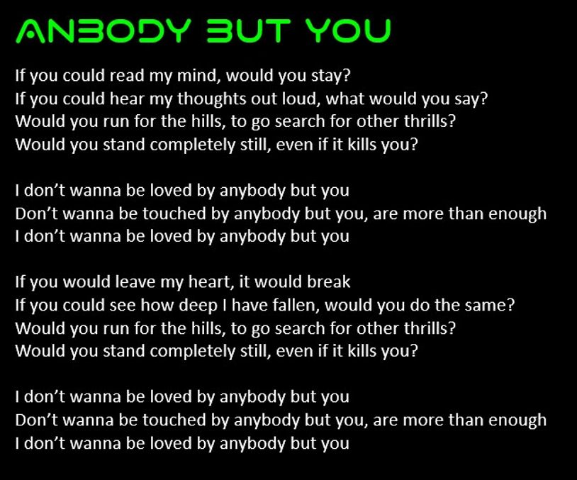"Anybody But You" is a heartfelt confession wrapped in emotional tension and quiet desperation. The lyrics pose a series of vulnerable questions—“If you could read my mind, would you stay?”—inviting the listener into a space of deep emotional honesty. It explores the fragile line between longing and fear, revealing the narrator's internal struggle: a love so intense it borders on obsession, paired with the terrifying uncertainty of how the other person truly feels.